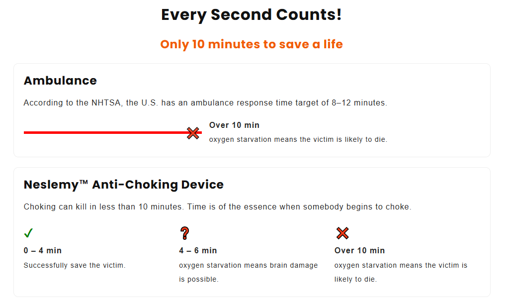 In just 4 minutes, choking can cause brain damage, leading to a lifetime of lost independence, while ambulance response times can take 7–14 minutes.